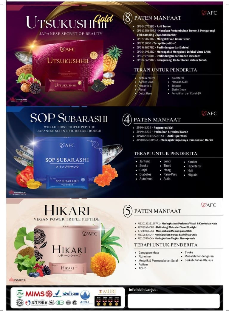 Produk suplemen dengan riset ilmiah dan standar Jepang yang aman dan efektif.